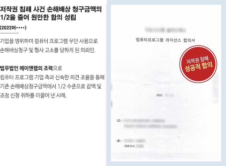 신상민, 김동완 변호사는 신속하게 솔리드웍스 측의 법률대리인과 의견을 조율하였고, 의뢰인의 기업 내 프로그램을 정품으로 교체할 것 및 정식 계약을 체결하는 것을 조건으로, 기존 손해배상 청구금액에서 1/2수준으로 감액하여 성공적인 합의 및 조정 신청 취하라는 결과를 이끌어 낼 수 있었습니다.