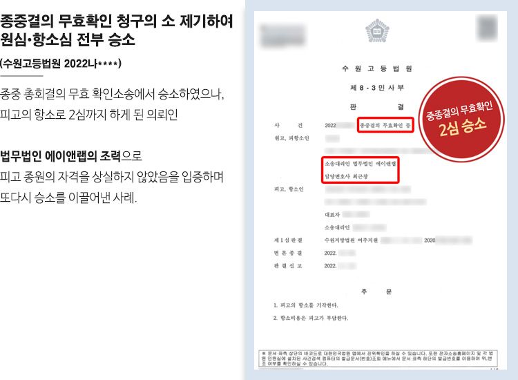 사건을 담당한 박현식 변호사의 조력으로 1심에서 승소하였으나, 피고 종중이 다시 한번 항소를 제기하였고, 이에 항소심까지 에이앤랩에서 책임지고 진행한 사건입니다.