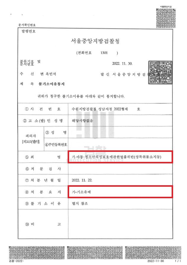 그러나 압수·수색 영장을 집행당하게 되었을 때까지 계속하여 소지하여 죄명이 구법에서 신법으로 변경되어 처벌 수위가 대폭 올라가게 되었고, 2회에 걸쳐 이루어진 보완수사요구로 성인이 될 때까지 마무리되지 않았습니다.