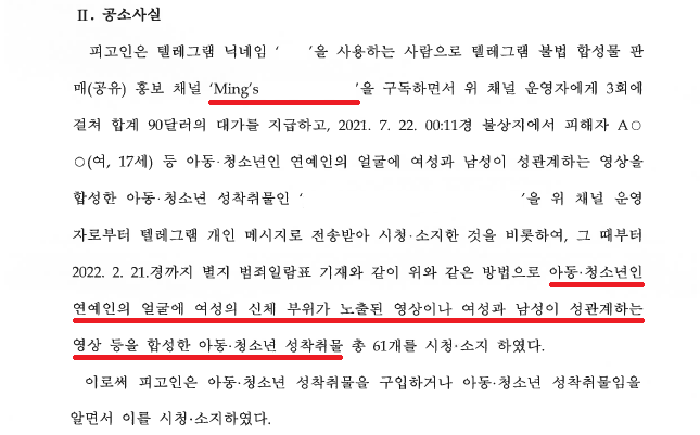 제작자, 판매자는 텔레그램에서 'Ming', 'eggfry', 'ddol'이라는 닉네임으로 활동하며 허위영상물 판매 채널을 운영하였습니다. 주변 사람, 텔레그램 인플루언서, 아이돌 그룹 연예인 등을 대상으로 허위영상물을 제작하고 판매하였습니다. 그 중에는 '오마이걸'의 ○○, '아이즈원'의 ○○○이 포함되어 있었고, 특히 '아이즈원'의 ○○○은 미성년자였습니다. 또한, '정기구독료'라는 명목으로 매달 20달러에서 30달러를 요구하였는데, 추적을 피하기 위해 미국에서 설립·운영하는 'gumroad'라는 프로그램으로 결제하도록 하였습니다.