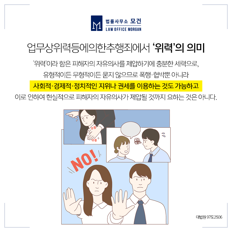 피고인은 한 회사의 부사장이고, 피해자는 같은 회사 직원으로 피고인의 지시, 감독을 받는 사람인데, 피고인으로부터 수차례 추행을 당하였다며 고소가 진행되어 피고인은 업무상위력등에의한추행 혐의로 기소되었습니다.