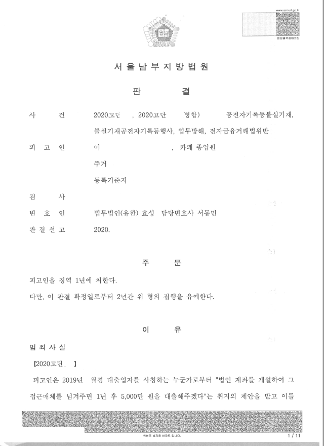 소위 '작업대출'로 허위법인을 설립하여 법인계좌 등을 건네주어 기소된 사건을 집행유예로 이끈 경우는 이미 포스팅 한 바 있습니다.