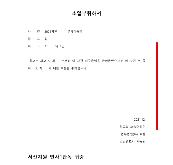 저는 즉각 입금 받은 자를 피고로 하여 민사소송 부당이득반환청구소송을 제기하였고 소장을 받은 피고가 피해액을 반환할테니 소를 취하해 달라고 요청하여 저희는 피해액을 반환받고 소를 취하하였습니다.