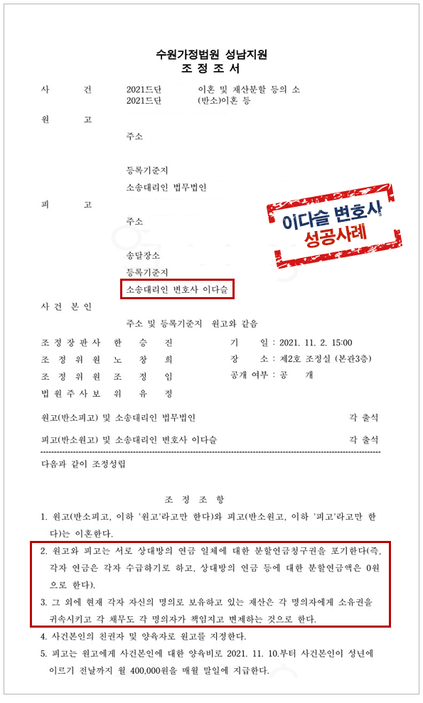 다만 조정이혼은 원고와 피고의 긴밀한 협의가 이루어져야 하고, 이를 중간에서 변호사가 어떻게 중재하고 합의점을 찾느냐가 매우 중요하므로 변호사의 조정능력이 관건이라 할 수 있는 만큼 경험많은 이혼전문변호사의 조력을 구하는 것이 유리합니다.