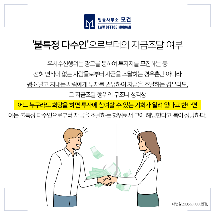 「유사수신행위법」 에서는 유사수신행위를 총 4가지로 정하고 있는데요. 유사수신행위는 다른 법령에 따른 인가·허가를 받지 않거나, 등록·신고 등을 하지 않고 불특정 다수인으로부터 자금을 조달하는 것을 업으로 하는 행위로서, 가장 대표적인 경우가 '장래에 출자금의 전액 또는 이를 초과하는 금액을 지급할 것을 약정하고 출자금을 받는 행위'입니다.