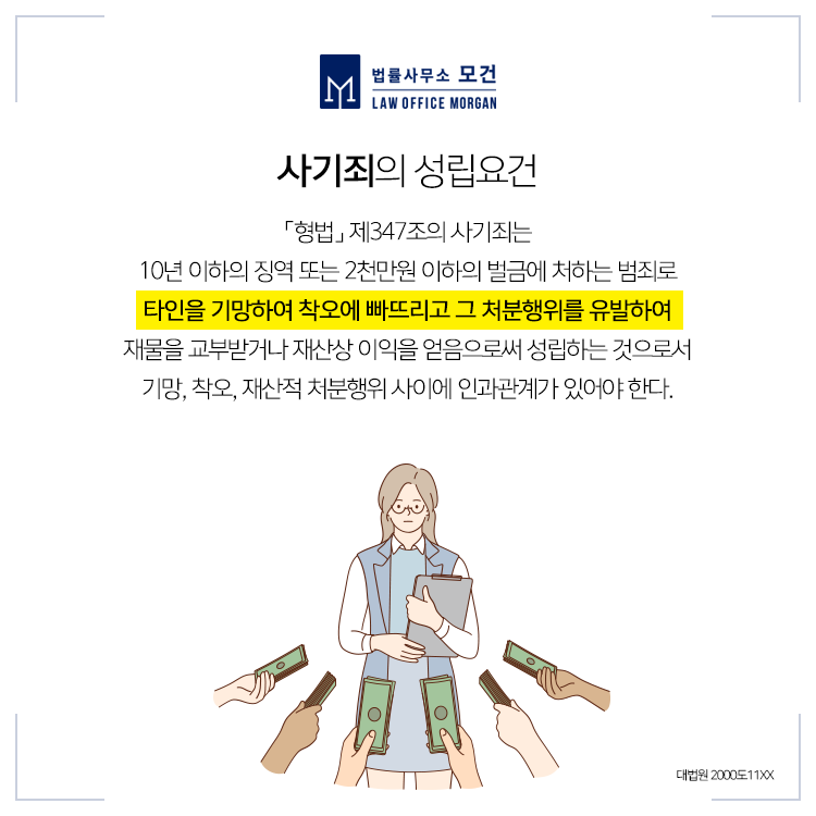 유사수신행위와 함께 처벌될 수 있는 경우가 '사기죄'인데요. 사기죄는 피해자를 기망하여 재산을 편취하는 범죄로, 투자자로부터 투자금을 받더라도 원금을 보장해 주고 약정한 수익금을 지급할 의사나 능력이 없었음에도 피해자를 기망하여 투자금을 편취하였다면 사기죄도 추가될 수 있습니다.