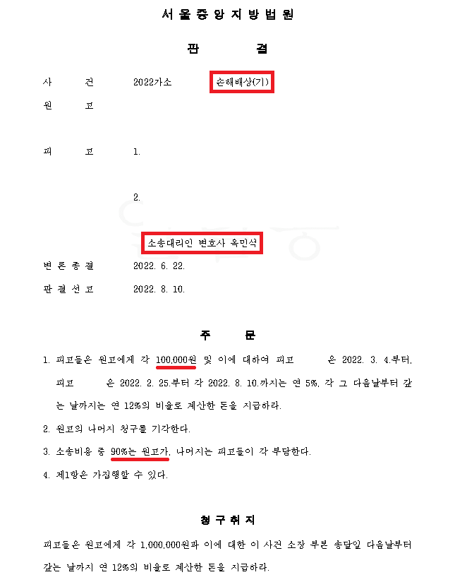 그 결과, 원고는 소송 도중에 청구 금액을 500만 원에서 100만 원으로 대폭 하향 조정하였고, 그마저도 10만 원만 인용되었으며, 나아가 소송비용도 거의 대부분인 90%를 원고가 부담하게 되었습니다.
