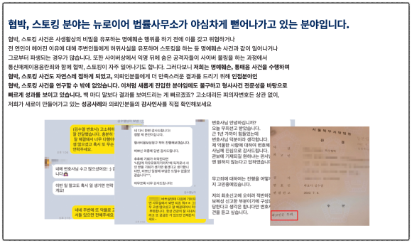 그러니 현재 직장내 협박으로 하루하루 고통받고 계신 분들이라면 우선 변호사를 찾아가 구체적인 상담을 먼저 받아보시길 권유 드립니다.