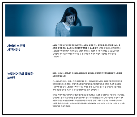 저희 로펌이 사이버 범죄만을 특화하여 형사 전문 변호사를 필두로 스토킹, 협박 사건을 책임지고 변호해 드리고 있습니다.