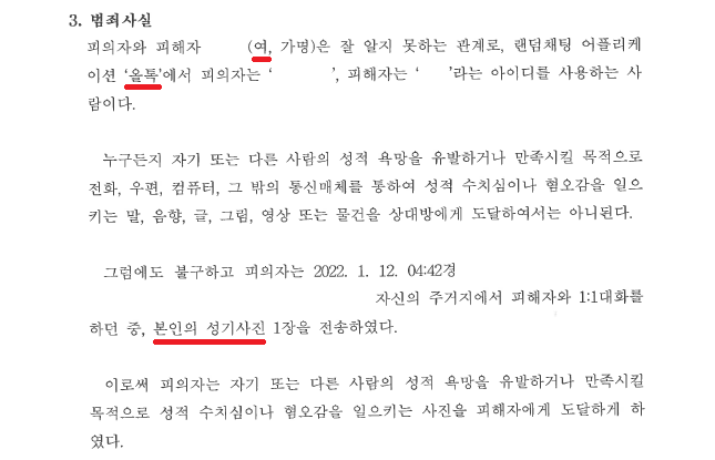 A씨는 2022. 1. 12. 04:42경 평소처럼 '올톡'에서 대화 상대를 찾다가 처음 보는 여성 B씨에게 다짜고짜 성기 사진을 전송하며 대화를 시도하였습니다. 그러나 B씨는 여느 '올톡' 이용자들과 마찬가지로 아무런 대답이 없었고, A씨는 늘 있는 일이기에 대수롭지 않게 생각하였습니다.