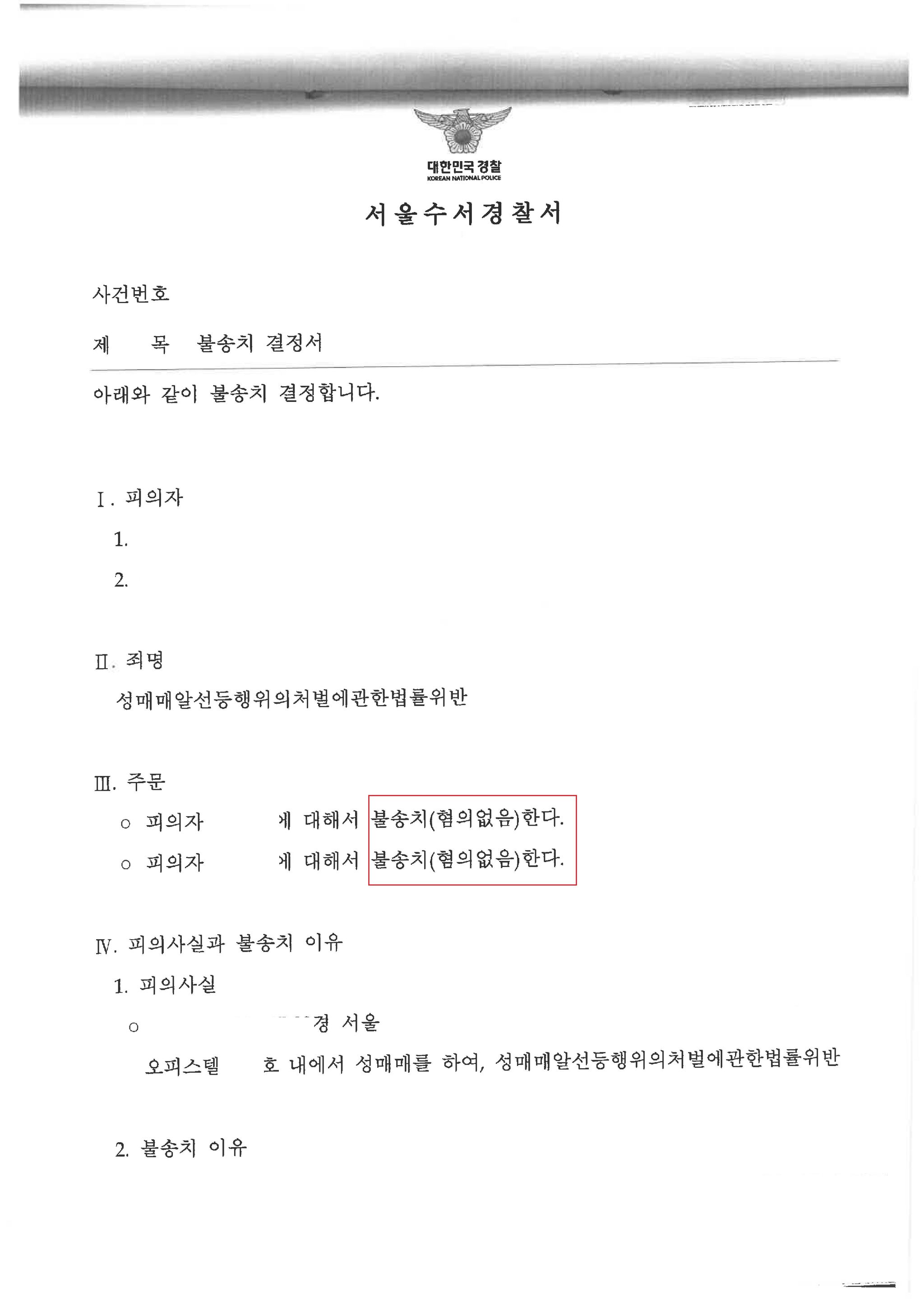 결국 성매매알선 사실을 입증할 증거가 없어 관련자들 모두 무혐의 결정을 받게 되었습니다만, 성매매만을 목적으로 운영되는 업장이 아니더라도 관련 정황이 있는 경우 얼마든지 성매매알선 등의 혐의로 단속이 되고 입건이 될 수 있다는 사실을 알 수 있고, 실제 성매매를 하지 않았더라도 조사를 받게 될 수 있으므로 이용에 있어 주의를 할 필요가 있습니다.