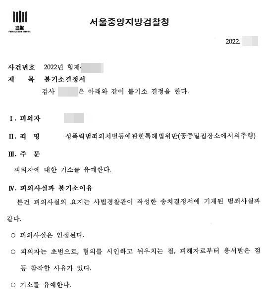 변호인 의견서가 제출되고 얼마 지나지 않아 의뢰인은 교육이수 조건도 없는 기소유예 처분을 받으셨습니다.