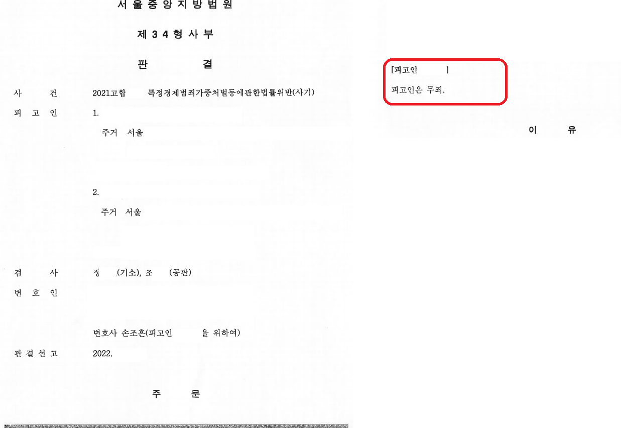 의뢰인은 고소인의 자금이 유치되는 과정에 관여한 사실이 없음에도 불구하고 나란히 형사재판까지 받게 되어 매우 억울한 심정이라고 하였고, 이에 손조흔 변호사는 이 투자과정에 관여한 사람들의 모든 진술 등 사건 기록을 면밀히 분석하여 법정에 증인으로 출석한 피해자로부터 의뢰인은 자금제공에 관여한 사실이 없다는 취지의 증언을 이끌어내는데 성공하는 한편, 다른 증인들로부터 공통된 취지의 증언을 이끌어 낼 수 있었고, 손조흔 변호사는 이를 바탕으로 의뢰인이 사기의 공범이 될 수 없다고 강력히 변호하였습니다.