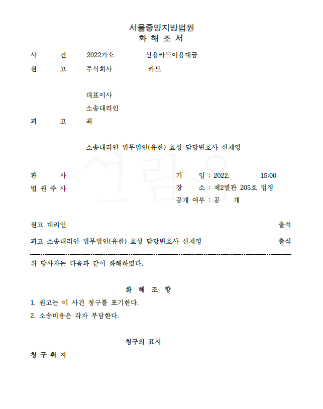저는 즉시 답변서 등을 통하여 동생이 명의도용/위조를 하였고 의뢰인은 채무자가 아님을 주장 입증하였고, 원고인 신용카드회사가 의뢰인에 대한 청구를 포기하는 것으로 재판상화해가 성립하여 의뢰인은 채무에서 벗어나게 되었습니다.