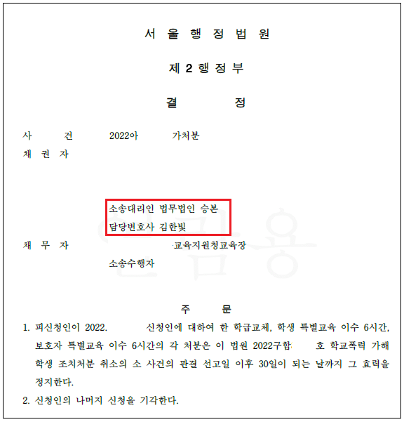 서울행정법원 담당재판부에서는 저희의 의견을 모두 받아드려 본안 소송인 학교폭력 가해학생 조치처분 취소 소송에 대한 판단이 나오기 전까지 교육청에서 내린 학급교체 및 교육이수 처분에 대한 효력을 정지하였고, 다행히 의뢰인은 원래 본인의 학급으로 돌아갈 수 있었습니다.