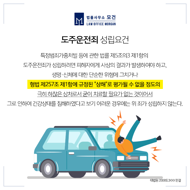 「특정범죄가중법」 상 도주치상죄는 운전자가 피해자를 구호하는 등의 「도로교통법」 상 사고후의 조치를 하지 않고 도주함으로써 피해자가 상해에 이른 것을 가중처벌하기 위한 조항입니다. 따라서 도주치상죄에 해당되려면 ①피해자의 상해가 「형법」에 규정된 '상해'로 평가될 수 있어야 하고, ②피고인에게 도주의 의사가 있었음이 증명되어야 합니다.