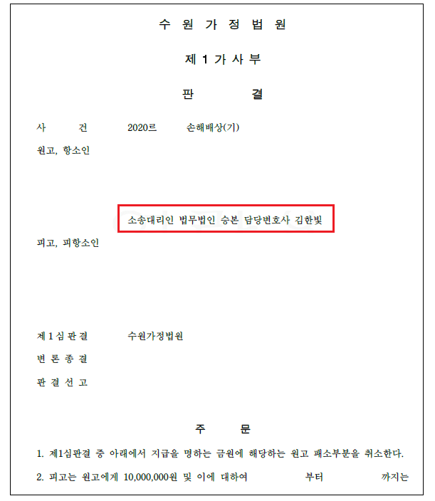 1심에서 그냥 지나쳤던 증거들을 다시한번 아주 세밀하게 검토하여 다시 피고와 의뢰인 배우자의 부정행위에 관하여 주장한 결과, 1심과 달리 상간 위자료 1,000만 원이 인정되었습니다.