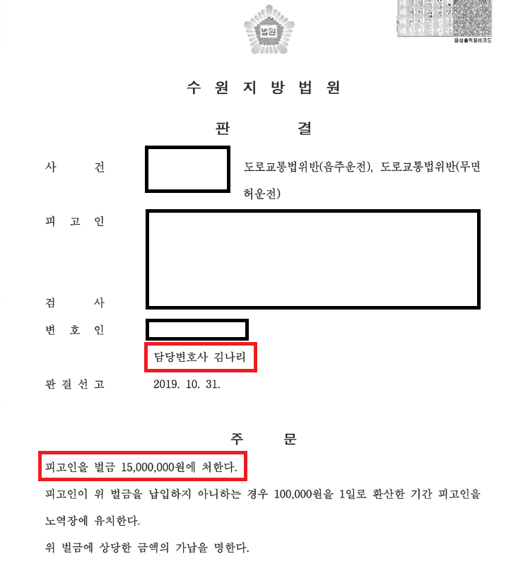 이뿐만 아니라, 법무법인 한원의 김&유팀이 음주사건을 담당하게 되면 기본적으로 제공하는 조력(음주습벽을 단절하겠다는 의지를 보여주는 행동, 중독치료, 병원방문 등의 자료 마련)을 더하여 1번의 변호인 의견서 및 2번의 변론요지서와 참고서면 제출을 통해 의뢰인이 만족할 만한 결과를 이끌어 낼 수 있었습니다.