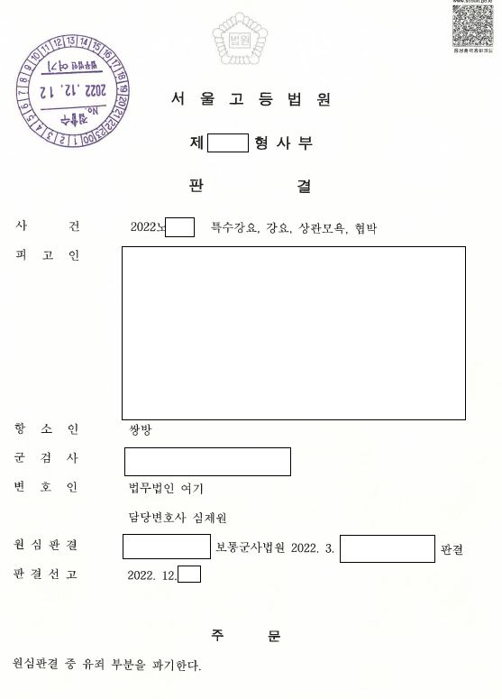 오늘은 1심 군사법원 선고사건이 이관된 서울고등법원 사건의 선고에 대해 포스팅을 합니다. 이 사건은 1심에서 상관모욕, 특수강요, 강요, 협박으로 기소가 되었고, 1심에서 상관모욕과 일부 협박에 대해 무죄를 선고하였습니다. 군생활을 계속할 수 있는 벌금형이 선고되어 워래 피고인은 항소를 하지 않으려고 했으나 군검찰에서 항소를 하여 피고인도 나중에 항소를 제기하였습니다.
