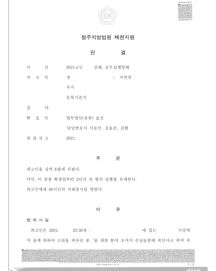 저는 즉각 경찰조사부터 의뢰인과 동석하여 조사에 임하였으며 피해자인 경찰관이 합의를 해 주지 않았지만 기타 양형사유를 적극적으로 주장 제출하여 법원은 집행유예를 선고하였습니다.