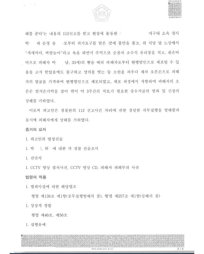 의뢰인분들 중 술에 취해 식당에서 난동을 피우다 신고를 받고 출동한 경찰을 술김에 폭행하여 상해를 입혀 그 자리에서 현행범체포가 되고 공무집행방해 및 상해로 기소되는 경우가 종종 있는데요.