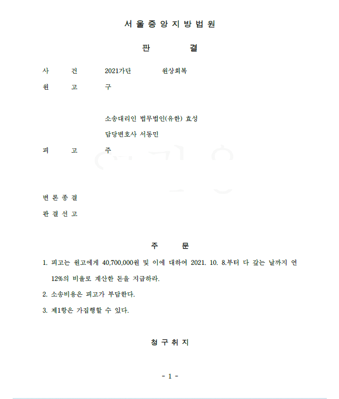저는 즉각 민사소송으로 계약해제에 기한 대금반환청구를 하였고 법원은 원고 전부 승소 판결을 선고하여 매매대금을 반환받게 되었습니다.
