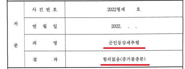 수사기관은 본 변호인의 주장을 받아들여 의뢰인에 대한 군인등강제추행의 점에 대하여 '혐의없음' 처분을 하였습니다.
