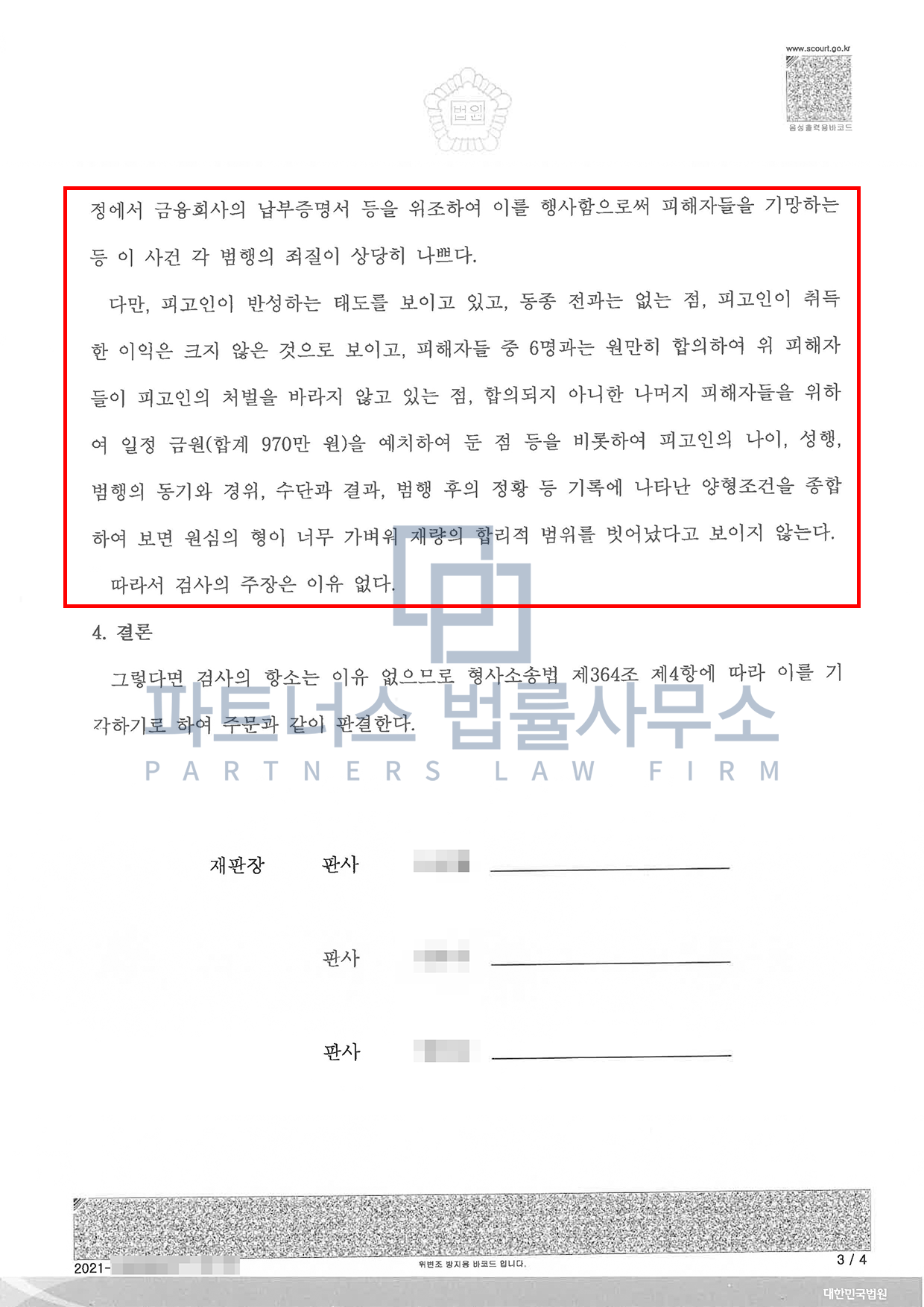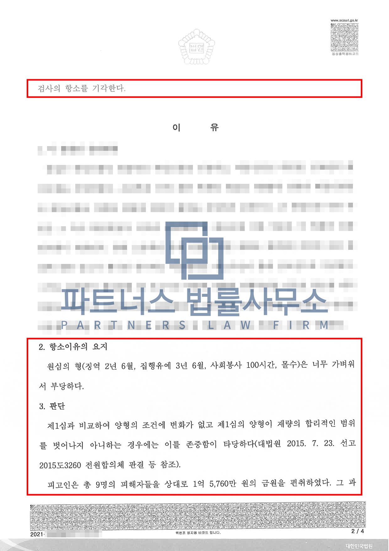 그런데 전부 합의가 없었음에도 집행유예로 석방되었다는 점에 대하여 검사가 항소를 제기하였고 다행히 항소심에서도 저희 파트너스법률사무소의 도움으로 검사항소를 기각시키고 1심의 집행유예 판결을 유지할 수 있었던 아주 다행스러운 사안입니다.