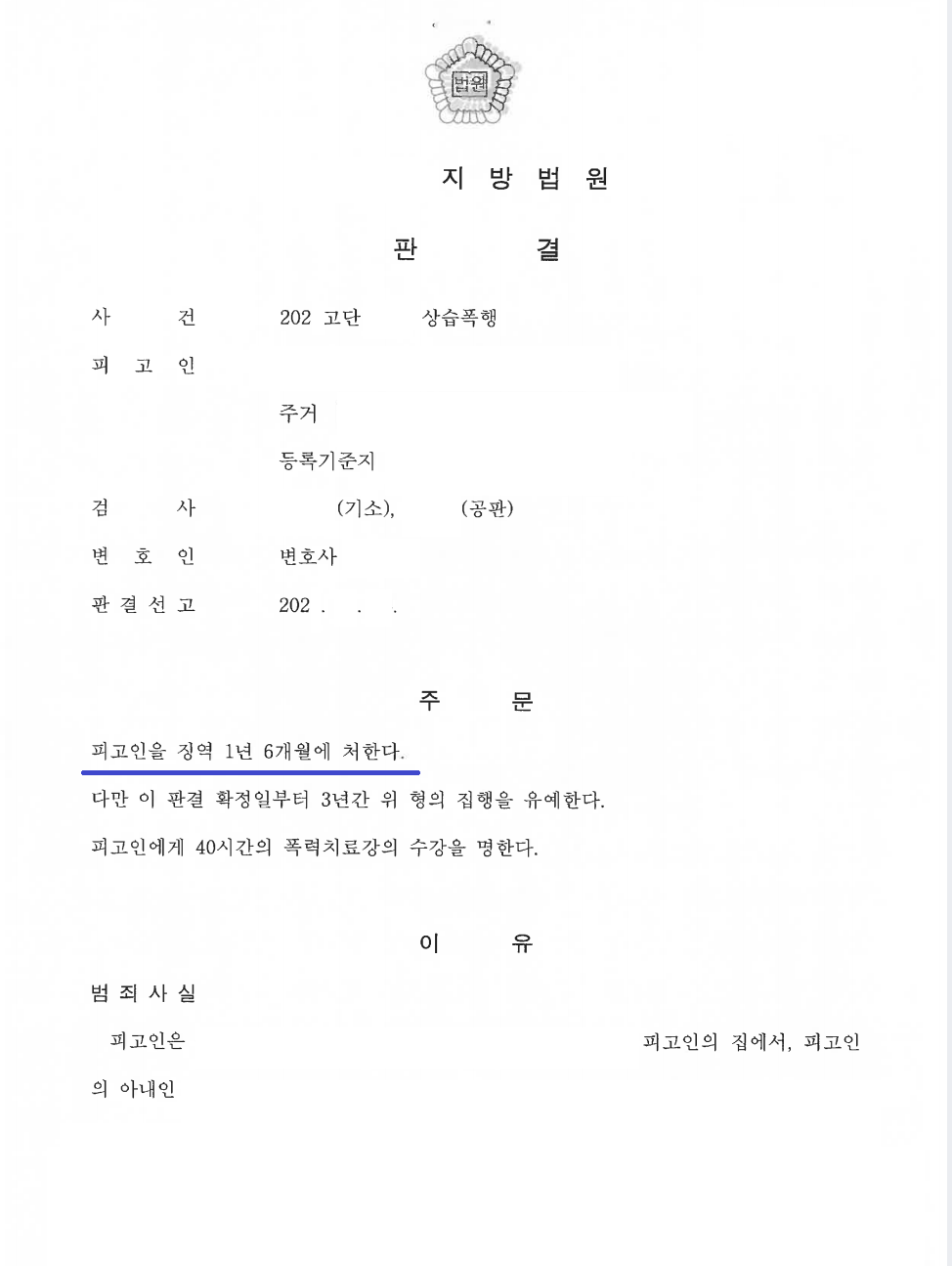 결국 남편은 상습폭행죄로 기소되었으며, 법원은 남편에게 징역 1년 6월(집행유예 3년)을 선고하였습니다. 의뢰인은 형사 공판 단계에서 남편과 합의하였고, 법원은 이를 감안하여 남편에게 실형을 선고하지 않은 사정이 있었습니다.