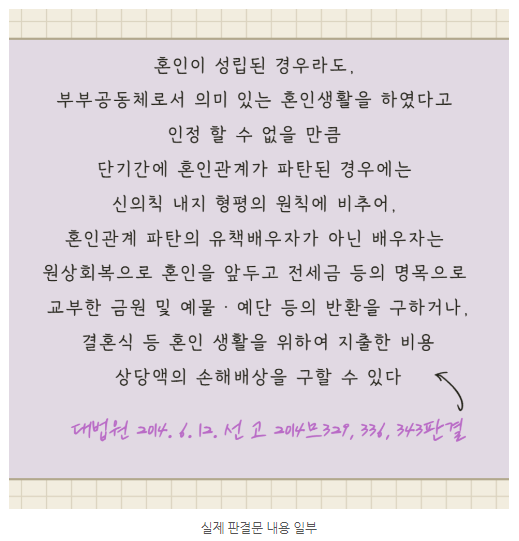 따라서, 저는 그 비용을 부담해야 하는 사람 또한 일방적으로 관계를 끊어버린 상대측이라는 것을 주장하였는데요. 사실혼을 파탄으로 이끌고 간 남편이 책임지는 것이 법적 원리에 맞는다고 하였습니다. 그래서 상대측에 '결혼식 비용 및 예단비 반환'을 함께 청구했죠.