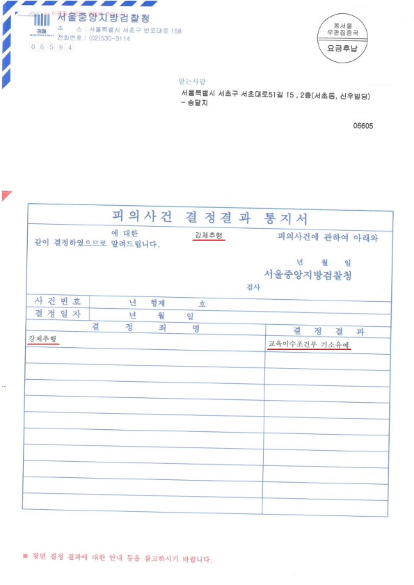 ※ 이에 서울중앙지방검찰청은 "기소유예" 처분을 하여 의뢰인님께서는 아무런 전과기록도 남지 않은 사건입니다.
