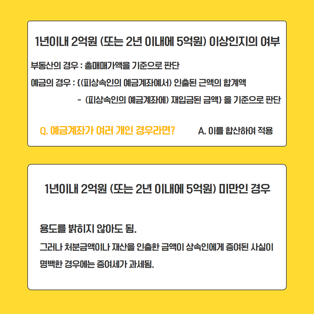피상속인의 재산을 처분하여 받은 금액 또는 재산을 인출한 금액은 '재산 종류별'로 구분하여 상속개시일 전 ①1년 이내에 2억원 이상이거나 ② 2년 이내에 5억원 이상인 경우로서 용도가 '객관적으로 명백하지 아니한 경우'에는 이를 상속인이 상속받은 재산으로 추정합니다.