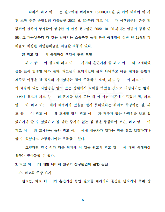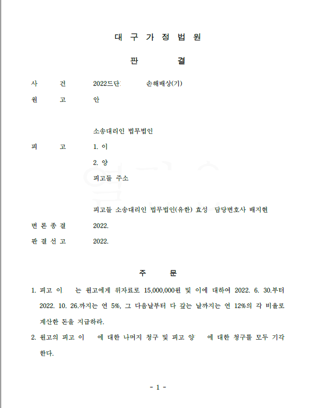 저는 즉각 답변서 등을 통하여 의뢰인이 원고 배우자와 사귀기 전에 이미 원고와의 혼인관계가 파탄난 점, 의뢰인은 원고 배우자가 유부남인지를 전혀 몰랐던 점 등을 중점적으로 주장 입증하였고 법원은 상간의 고의가 없다고 판단하여 원고 청구 기각 판결을 선고하였습니다.