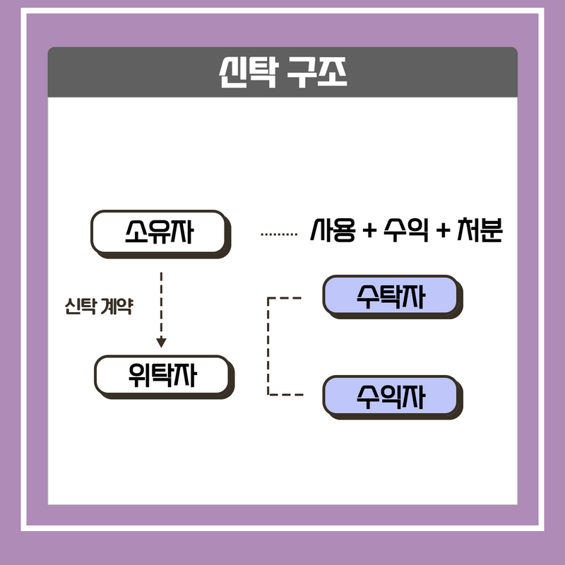 - 수익자: 신탁재산으로부터 이익을 누리는 주체 (일반적으로는 위탁자와 수익자가 같으나, 다를 수 있음)