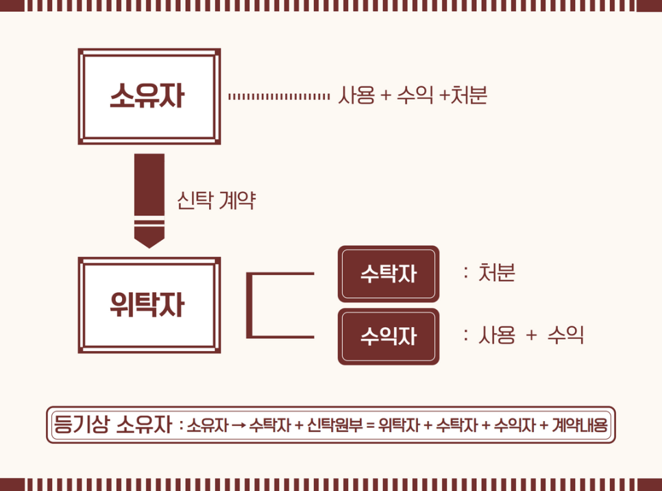 즉, 신탁을 통해 위탁자가 특정 재산을 수탁자에게 이전하고, 수탁자로 하여금 수익자의 이익을 위하여 그 재산권을 관리·처분하는 법률적 관계가 형성됩니다.