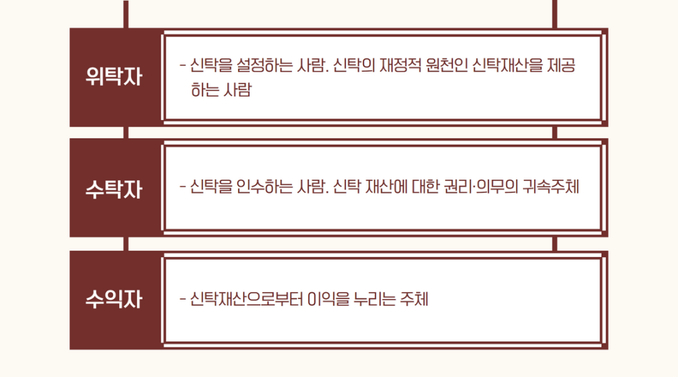 신탁은 위탁자, 수탁자, 수익자를 기본 요소로 하는데요, 각각 정의부터 알아보겠습니다.