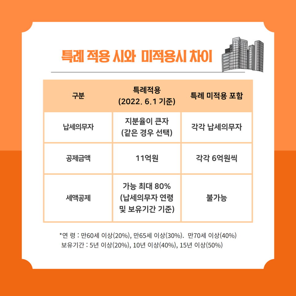 그러나, 2021년부터 부부공동명의 1주택의 경우, 납세자가 신청(9.16~9.30)한 경우에는 1세대 1주택자로 간주하여 기본공제 11억원 및 세액공제를 적용받을 수 있게 되었습니다. 이 경우에는 1세대 1주택자의 세액공제를 받을 수 있게 됩니다.