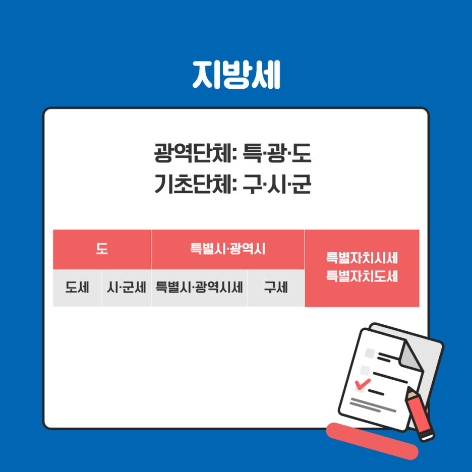 지방세는 위와 같이 특별시광역시에서 부과하는 특별시·광역시세, 구세가 있고, 도에서 관리하는 도세, 시·군세가 있습니다. 여기에 특별자치시세·특별자치도세가 있습니다. (ex. 세종특별자치시, 제주특별자치도)