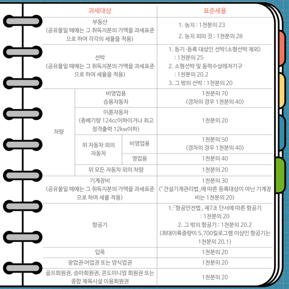 부동산, 차량, 골프회원권, 콘도미니엄회원권 등의 취득에 대해 해당 부동산 소재지의 도에서 그 취득자에게 부과하는 지방세입니다. 상속으로 부동산, 준부동산(차량, 기계장비, 항공기, 광업권, 어업권 등), 회원권(골프회원권, 콘도미니엄회원권 등)의 재산을 취득하는 경우 부과합니다.