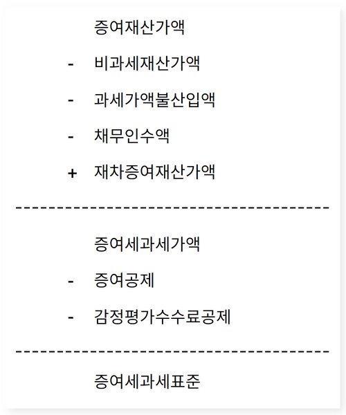 일반적으로 증여재산의 증여세 과세표준은 위와 같습니다. 비과세재산가액이란 국가로부터 증여받은 재산 등을 말하고, 과세가액불산입액은 공익법인 등이 출연받은 재산을 말합니다. 채무인수액은 수증자가 인수한 증여재산에 담보된 채무액을, 재차증여재산가액은 증여일 전 10년 이내 동일인으로부터 증여받은 재산을 뜻합니다. 증여공제는 증여재산공제, 재해손실공제가 있습니다.