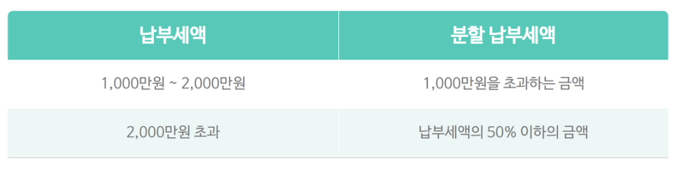 만약 자진납부할 금액이 1천만원을 초과하는 경우에는 아래의 분할납부세액을 납부기한 경과 후 2개월 내에 무이자로 분할납부할 수 있습니다.