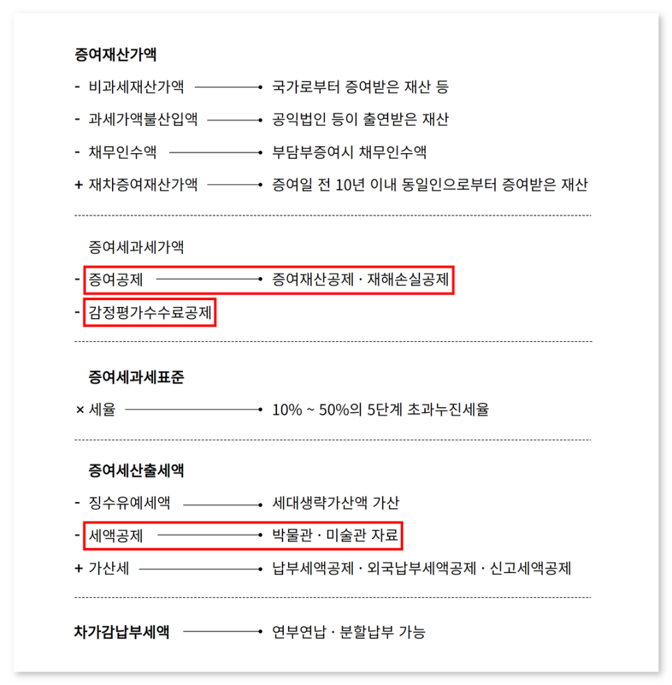 증여세를 계산할 때 어느 부분에서 공제가 되는지를 먼저 알아야겠죠? 위 계산 구조도에서 빨간 박스 표시한 부분이 공제 부분입니다. 과세표준을 구할 때 증여공제, 감정평가수수료 공제가 있고, 증여산출 세액에서 한 번 더 공제가 이루어집니다. 일반적으로는 증여재산공제, 감정평가수수료공제, 신고세액공제 정도만 기억하시면 되지만, 각각에 대해 자세히 설명해드리겠습니다.