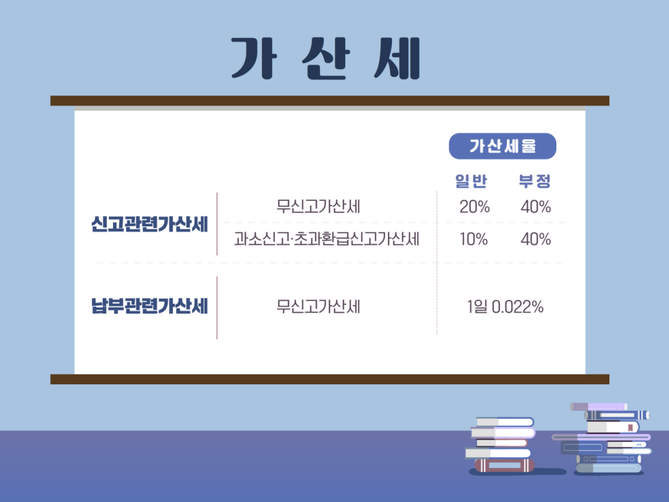 기본 구조는 국내주식 양도소득세와 동일하게 적용되며 이익이 발생한 부분과 손실이 발생한 부분의 모든 합을 통해 산출된 이익을 기준으로 과세 됩니다. 만약 손실액이 이익보다 더 크다면 해외주식 양도소득세는 내지 않아도 됩니다. 다만 해외주식 양도소득세는 스스로 신고를 해야하기 때문에 혹시 내가 모르는 해외주식 양도차익으로 인해 무신고 가산세를 내야 할 수도 있으니 신고하는 것을 추천드립니다. 가산세는 납부할 세액의 가산세율을 적용하여 납부하게 됩니다.