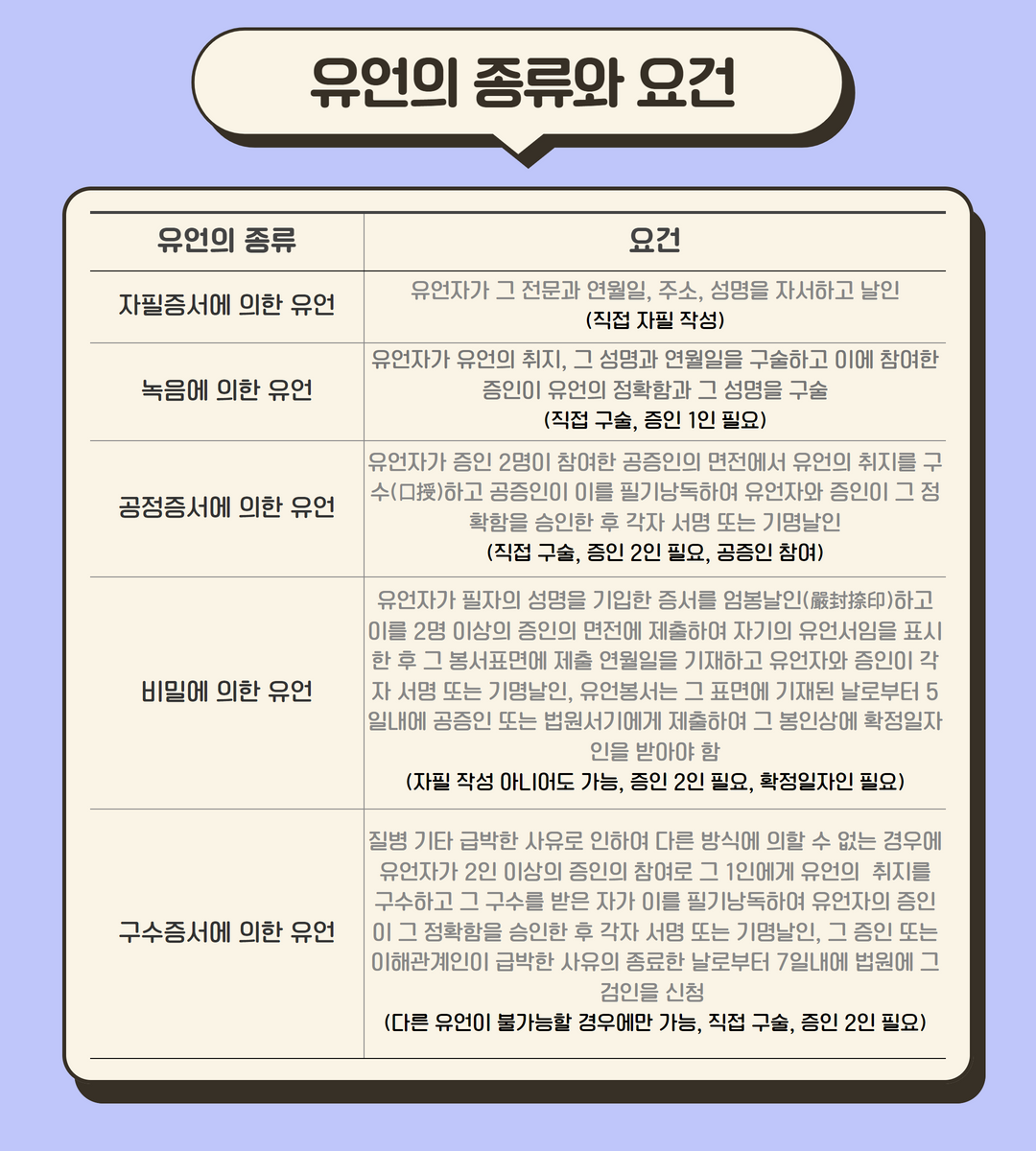 1편에서 살펴보았던 유언의 종류와 요건은 아래의 표를 참고해주세요.