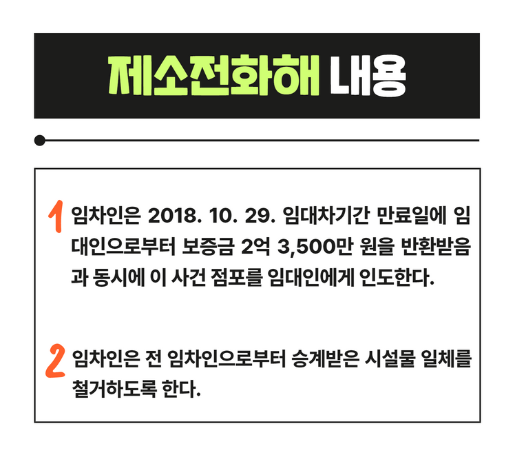 임차인와 임대인은 위 특약사항에 따라 아래와 같은 내용의 제소전 화해를 하였습니다.