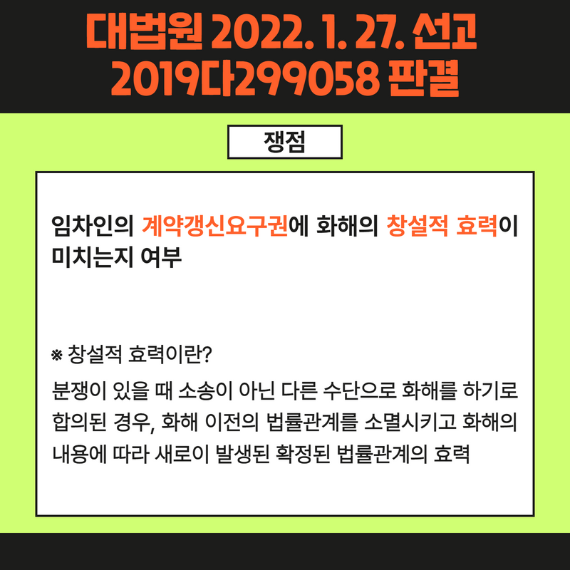 이 사건 판례에서 다루어진 쟁점은 임차인과 임대인이 점포에 관하여 임대차계약을 체결한 후 “임차인은 임대차기간 만료일에 임대인으로부터 임대차보증금을 반환받음과 동시에 점포를 임대인에게 인도한다.”라는 내용의 제소전 화해를 하였는데, 임차인이 임대차기간 만료 전 임대차계약의 갱신을 요구한 사안에서, 임차인의 계약갱신요구권에 화해의 창설적 효력이 미치는지 여부입니다.
