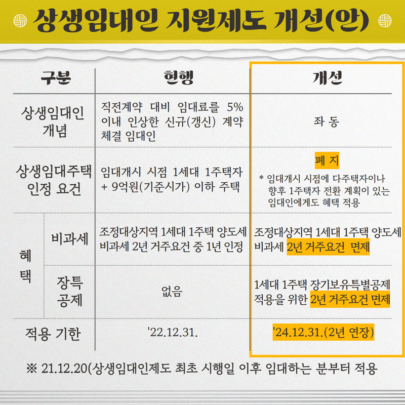 상생임대인제도의 확대 개편 방안으로는 상생임대주택 요건 완화 및 혜택 확대, 적용 기한 연장 등이 있었는데요, 자세한 내용은 다음과 같습니다.