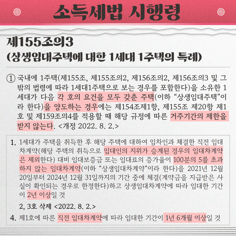 상생임대인제도란 직전 계약 대비 전월세를 5% 이내로 올린 집주인에게 양도세 비과세를 위한 실거주 요건을 면제해 주는 제도로서 2021년 12월에 처음 도입되었습니다. 그리고 임차인의 부담을 낮춰주기 위하여 확대 개편 방안이 2022년 6월에 발표되었고 이후 소득세법 시행령이 개정되어 2022. 8. 2. 부로 시행되었습니다.