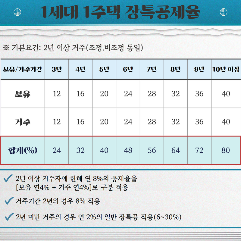 ▶장특공제 혜택은 기존에는 없었으나 개정 후에는 1세대 1주택의 장기보유특별공제에 적용을 위한 2년 거주 요건이 면제되었습니다.
