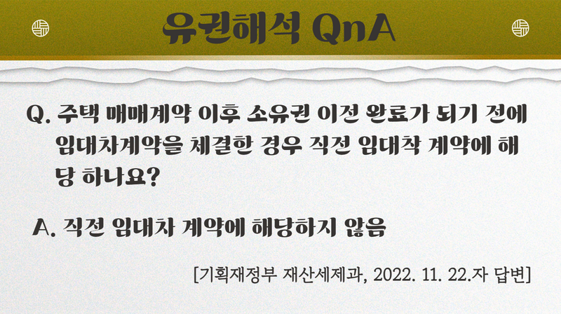 다음으로는 2022년 11월 22일에 올라온 것으로서, '주택 매매계약 이후 소유권 이전 완료가 되기 전에 임대차 계약을 체결했으나 소유자와 새 임차인이 임대차 계약을 직접 체결했고 실제 임대차 실행은 소유권 이전이 완료된 후인 경우에 상생임대주택 특례로서 직전 임대차 계약에 해당하는지'에 대한 질문이 있었습니다. 이 사례의 경우에는 매수인이 잔금 전에 새 임차인과 임대차계약을 체결한 경우로서 20년 6월에 매매계약을 하고 20년 7월에 매수인이 주택을 취득하기 전 임대차 계약을 작성한 후 20년 9월에 주택을 취득하였습니다.